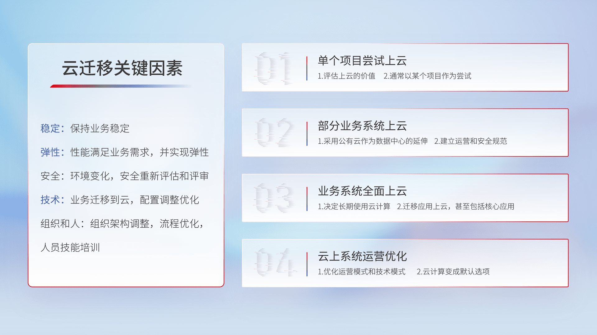 结合实际业务,,,,从规划设计、、、云平台选型、、、云原生改造、、、数据迁移、、、集成交付,,,迁移全过程为客户识别最佳上云路径,,,做好风险识别管理,,设计网络架构、、、身份权限、、安全审计合规、、操作审计、、、日志审计、、监控告警策略、、、多站点容灾设计等,,,对云上基础设施进行整体规划,,提升IT治理水平,,,以满足弹性、、、、高可用、、、、高性能的需求。。。