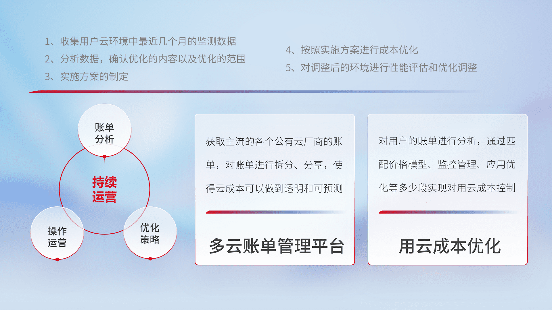 通过多云纳管,,以统一的资源数据模型把客户的云资源进行抽象和封装,,,,进而实现对多云资源的统一操作,,,保障云资源管理的可靠性、、、、稳定性与可用性。。量身定制化运维内容,,,配置、、、、开发运维、、、补丁管理、、备份、、监控、、认证和访问管理、、审计和日常巡检等,,,保障在用云过程中的可靠度,,,,稳定度以及高可用率。。。。