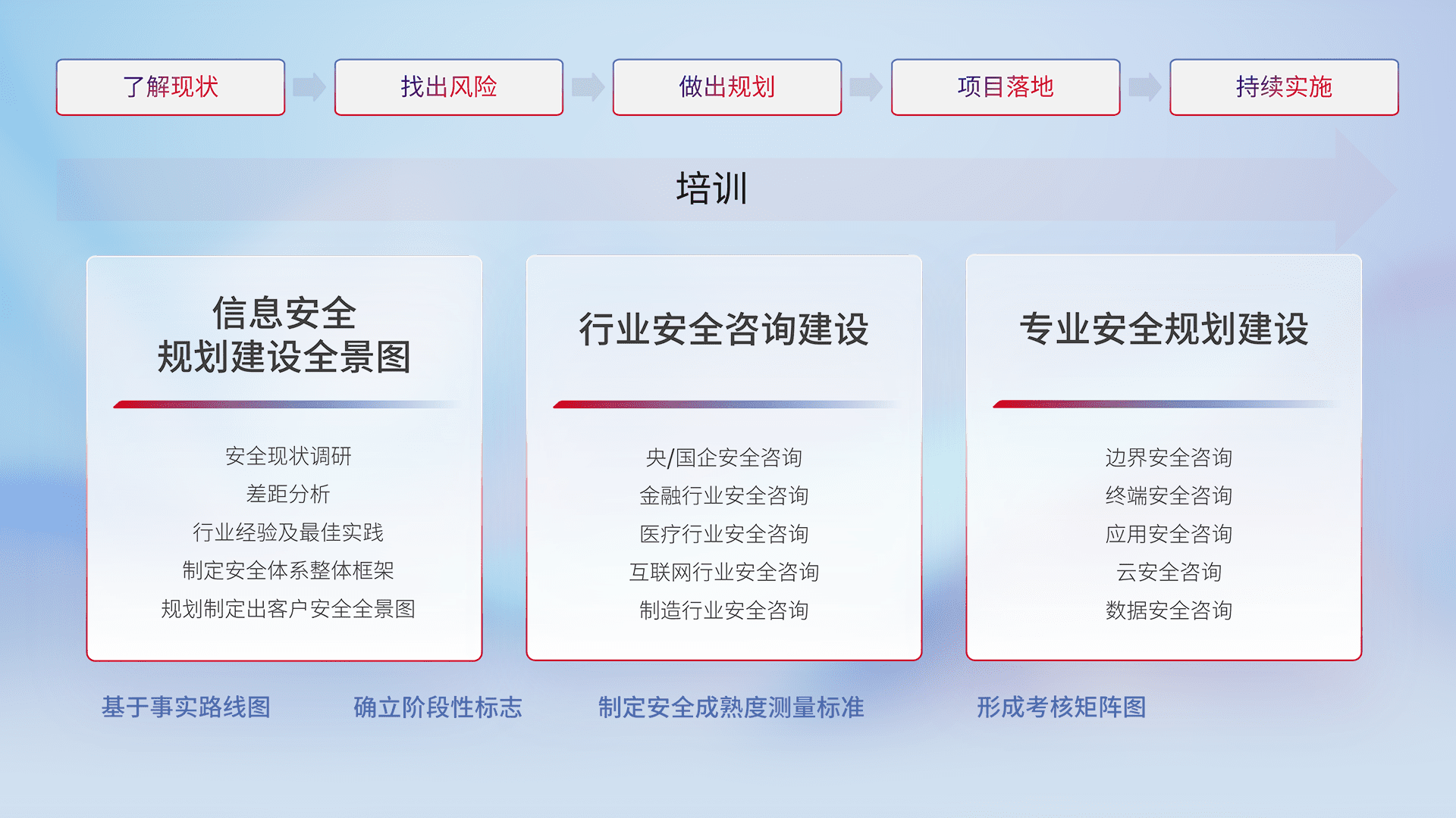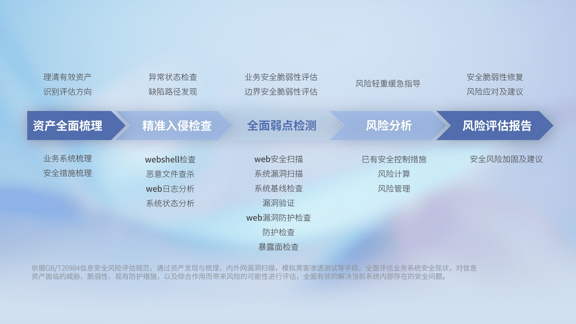针对客户行业特性,,,以专业的安全服务+多厂商联合解决方案提供专属的一站式安全管理服务,,,帮助客户全面感知网络空间威胁,,,基于识别、、、检测、、、、分析、、防护、、监测、、、响应的服务理论模型,,,,从方案咨询、、、、集成交付、、、、评估验证、、、、优化加固、、、、运维运营,,致力于为客户提供完整的闭环管理式安全服务。。。以实战经验为客户打造高抵御风险的安全体系,,帮助客户发现威胁、、、对抗威胁、、处置威胁,,不断积累安全对抗能力,,持续保障数字化安全。。。